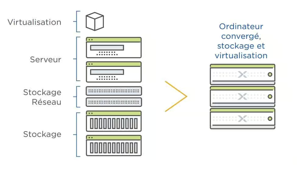 Elle combine les trois composants d’une infrastructure informatique : serveurs, baies de stockage, réseau de stockage.